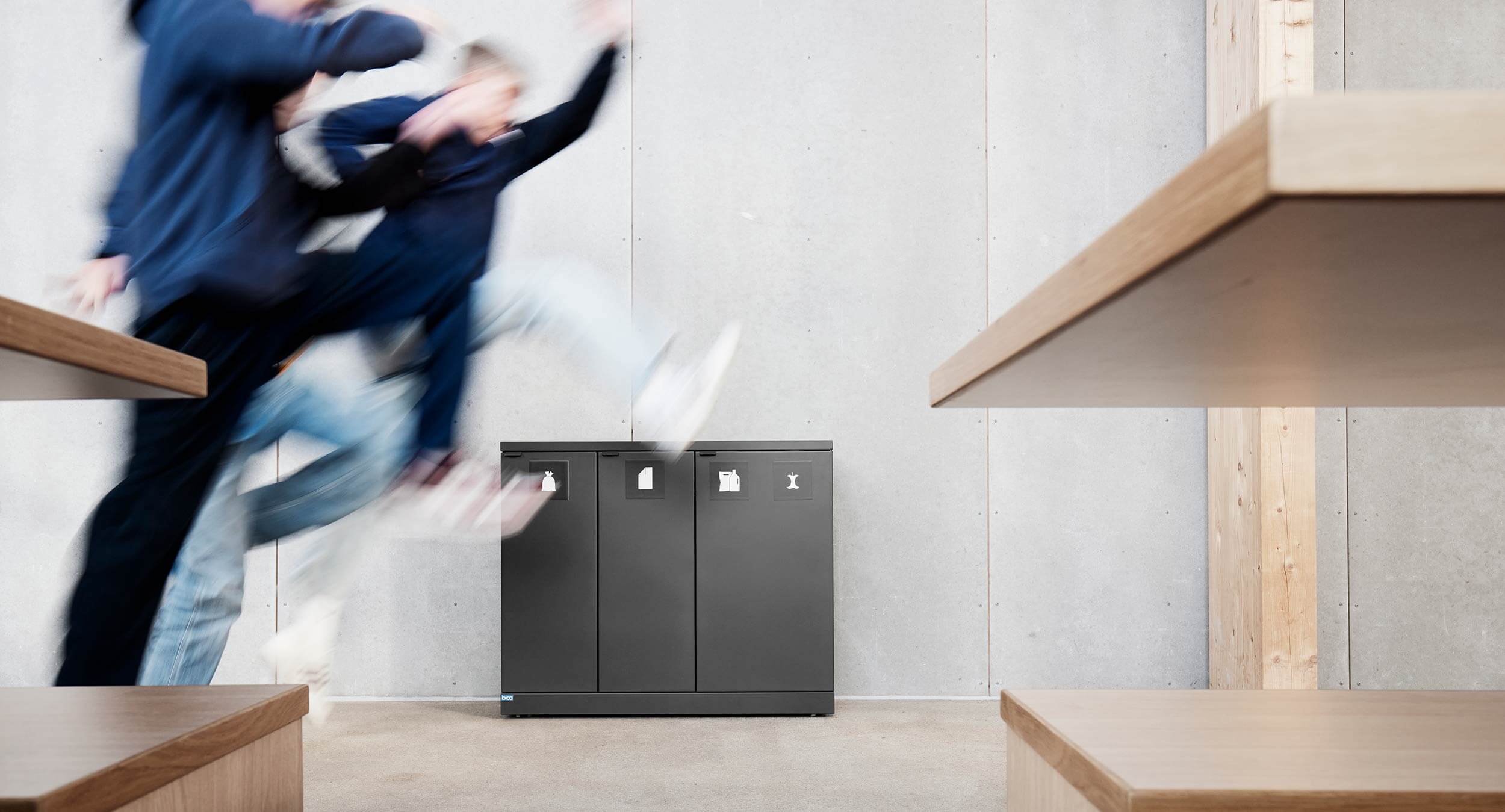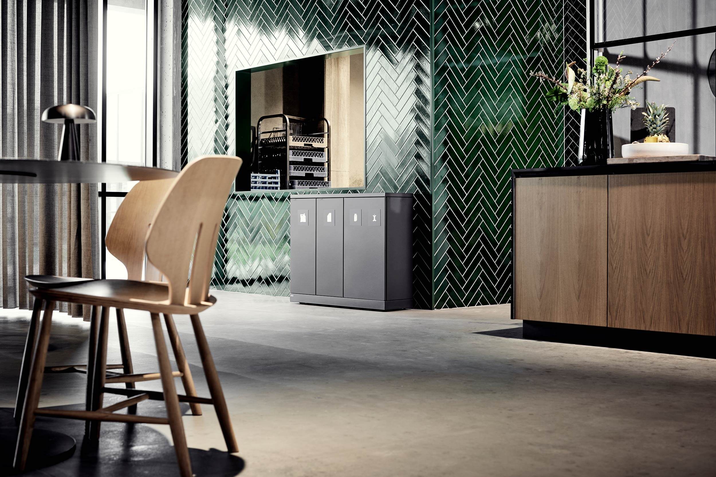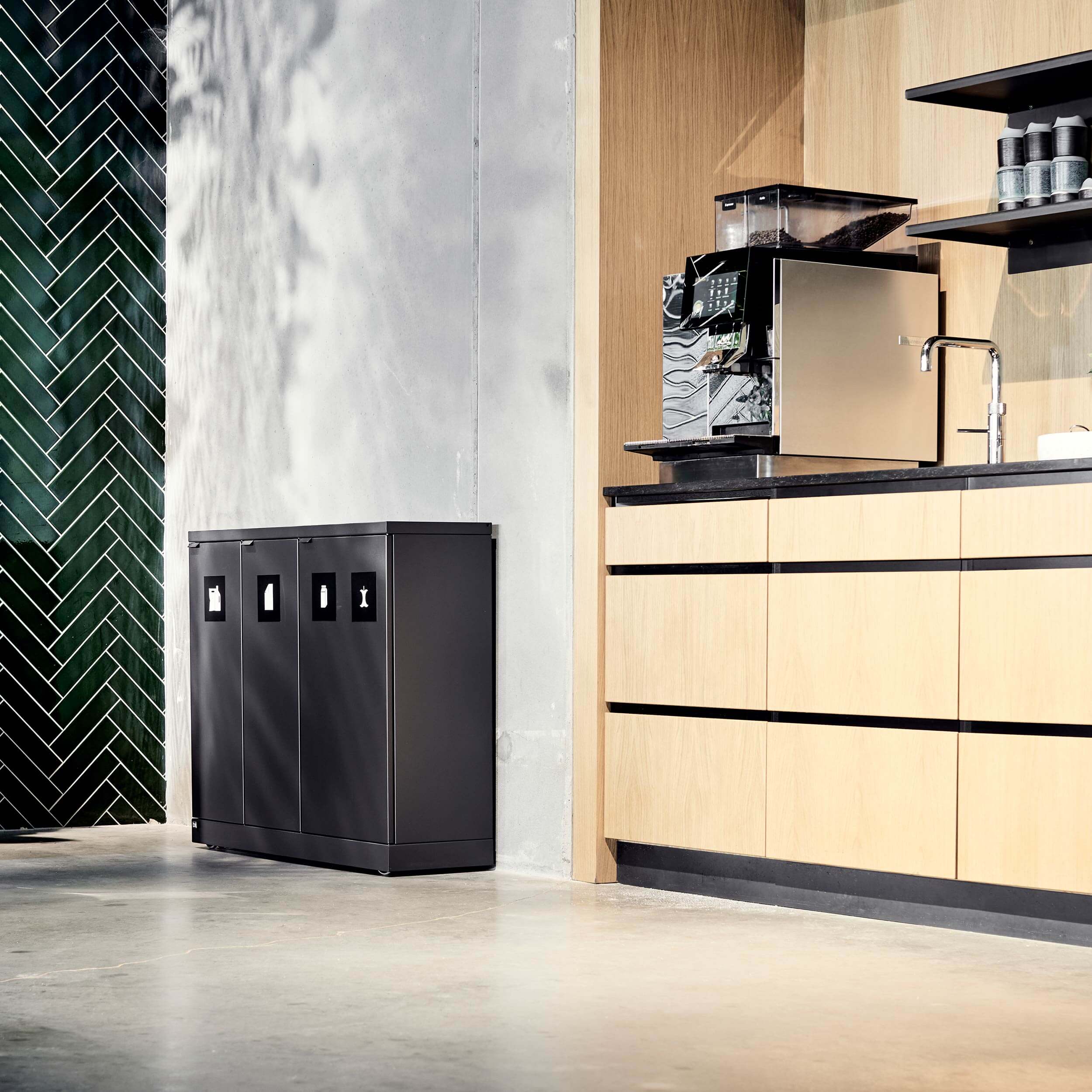 Fleksibelt affaldssystem fra Bica sikrer nem og brugervenlig affaldssortering på arbejdspladsen. Affaldssystemet tillader differentieret volumen i en samlet løsning, som er praktisk, hvis man har brug for sortering i forskellige mængder. Der er monteret hylder i fraktionen 2x45 liter, hvilket giver mulighed for at indsætte inderbeholdere i plast til skarpt affald, hvor posen kan gå i stykker.