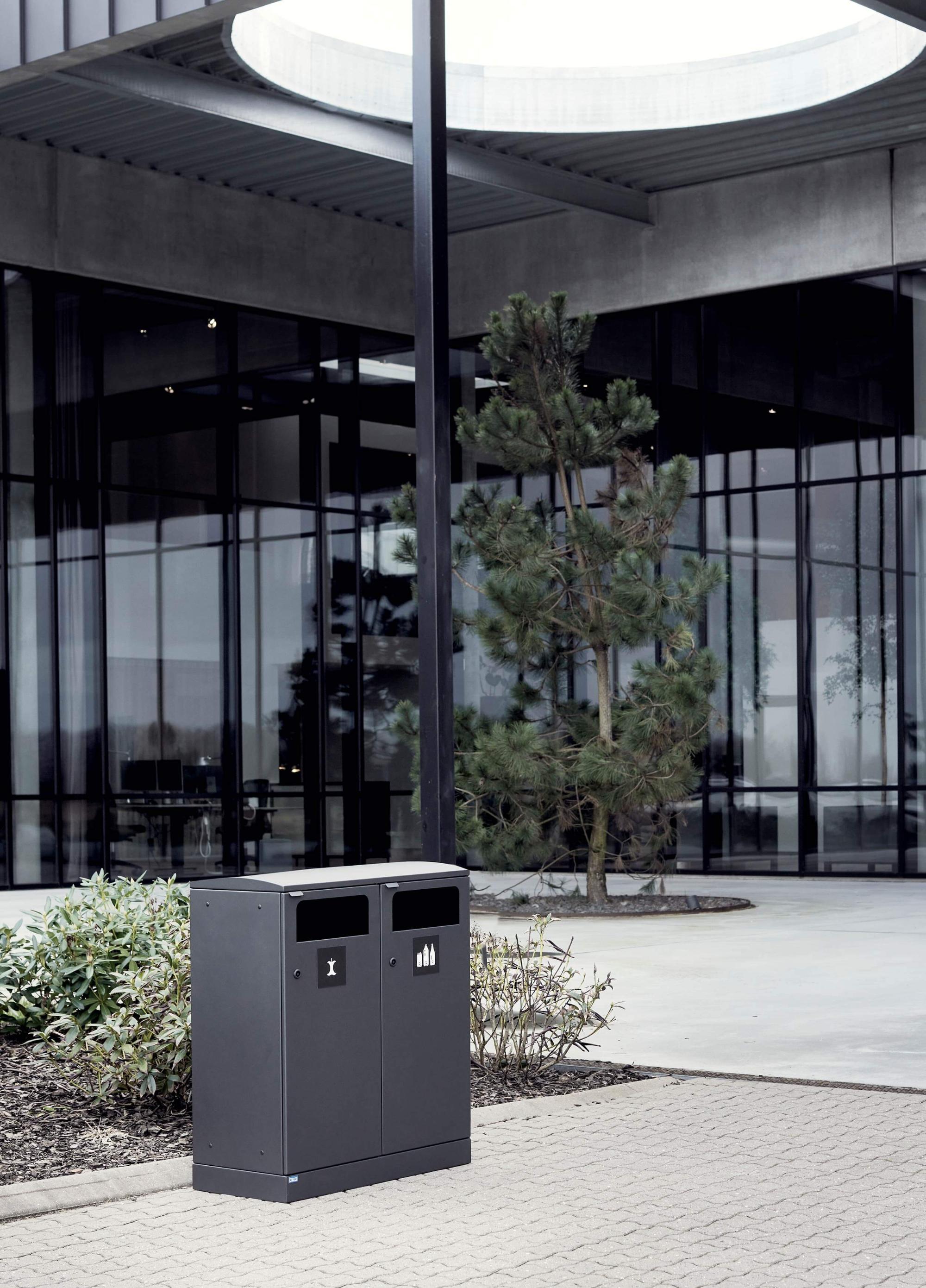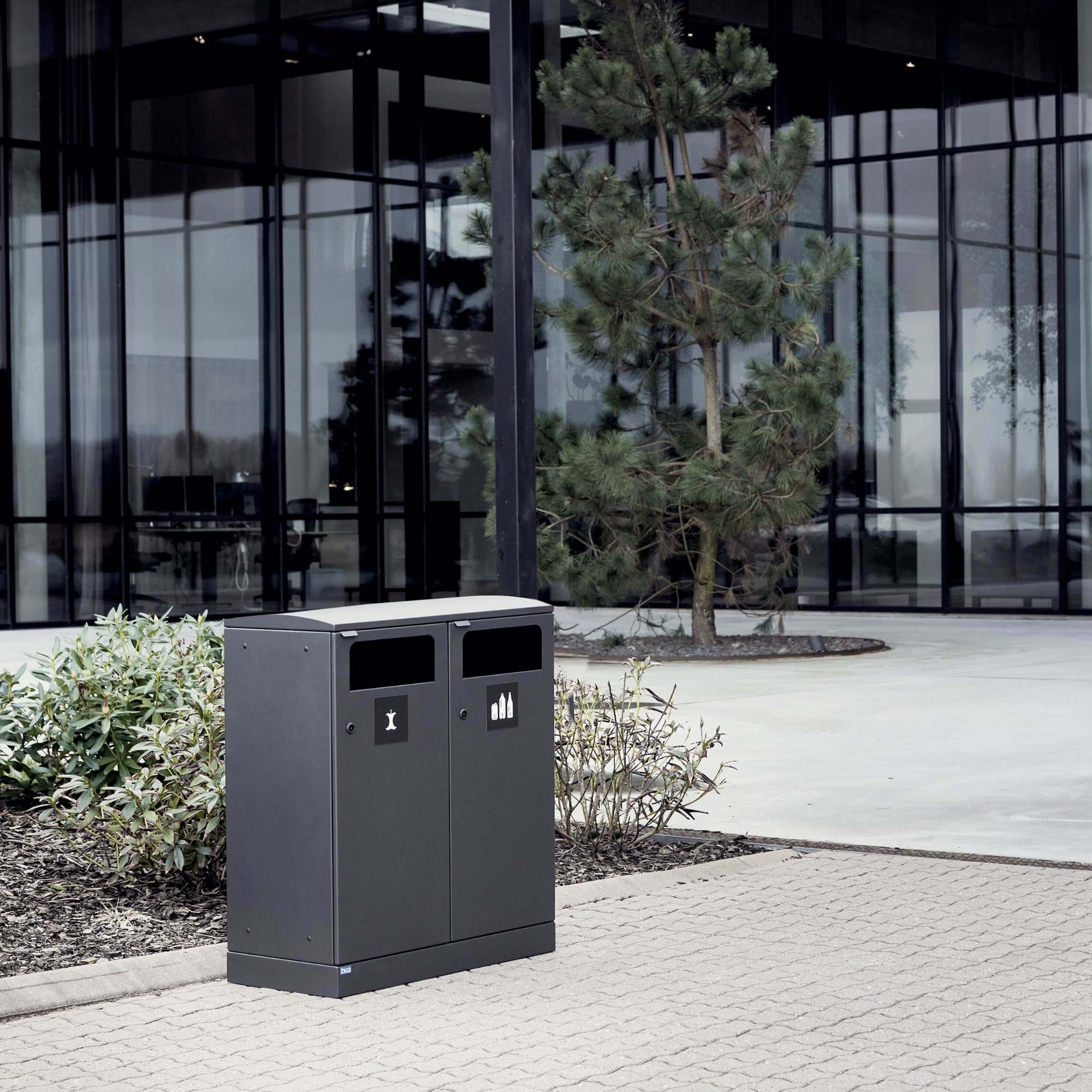 Affaldssystemet er udstyret med frontdøre for ergonomisk korrekt tømning uden tunge løft. Affaldssystemet er udstyret med en integreret og stærk poseholder, så posen bliver siddende. Den lukkede top skjuler samtidig posen, så affaldssystemet bevarer et stilrent design. Den er forberedt til fastgørelse i underlaget, så den ikke kan flyttes med og kan samtidig aflåses.